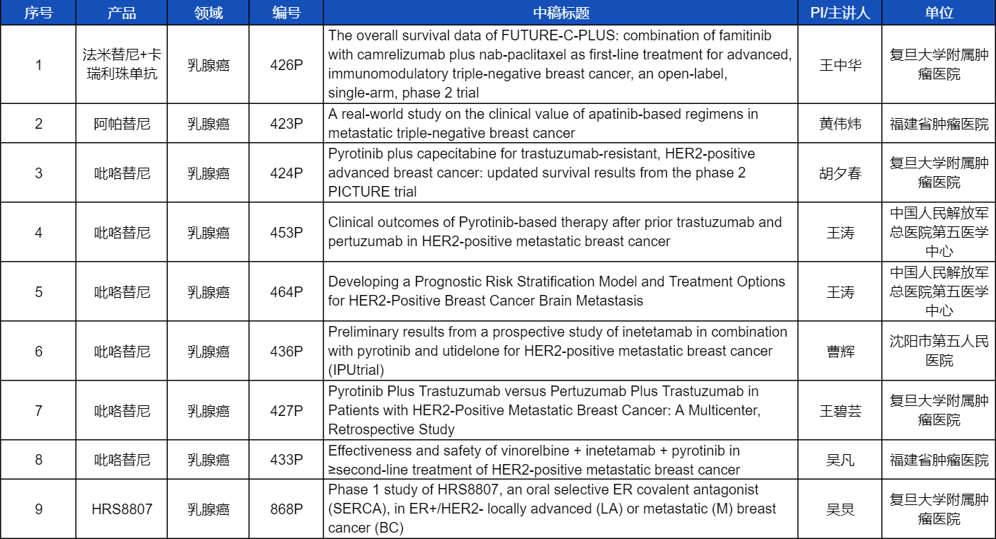 12款抗肿瘤创新药包括6款已上市产品:注射用卡瑞利珠单抗(艾瑞卡®)、甲磺酸阿帕替尼片(艾坦®)、马来酸吡咯替尼片(艾瑞妮®)、阿得贝利单抗注射液(艾瑞利®)、氟唑帕利胶囊(艾瑞颐®)、瑞维鲁胺片(艾瑞恩®),以及6款未上市产品:多靶点受体酪氨酸激酶抑制剂法米替尼、抗PD-L1/TGF-βRII双抗SHR-1701、组蛋白甲基转移酶EZH2抑制剂SHR2554、HER2抗体偶联药物(ADC)SHR-A1811、HER3抗体偶联药物SHR-A2009、新型选择性雌激素受体共价拮抗剂(SERCA)HRS8807等。此次ESMO大会的最新突破摘要(LBA)结果尚未披露,敬请期待!本文特对33项研究成果做了梳理,带领各位读者领略AG真人医药创新之光。
